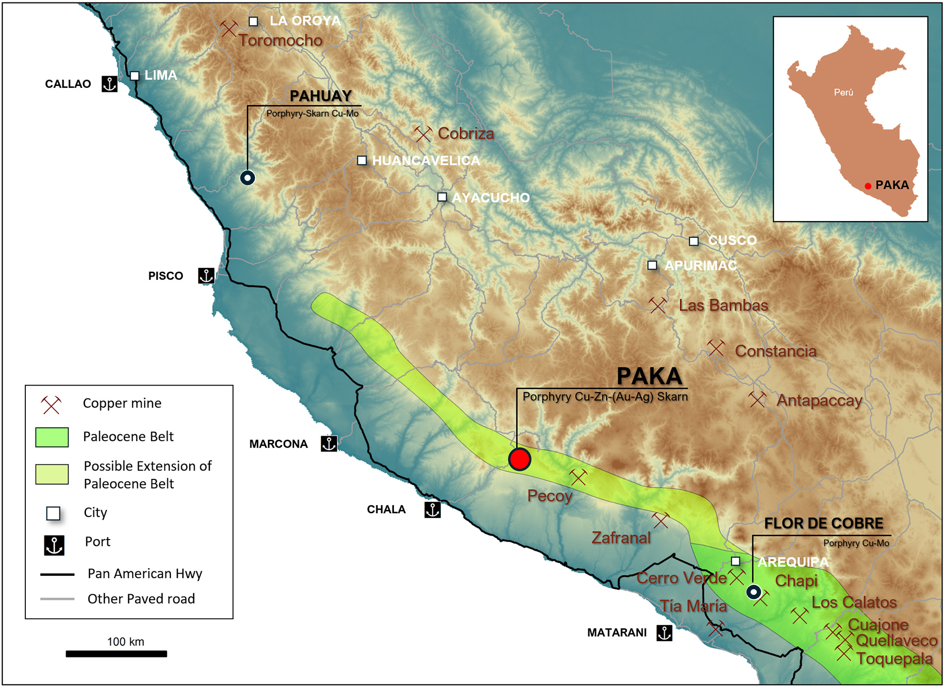 Figure 1: Location map of the Paka Porphyry-Skarn Cu-Zn-(Au-Ag) Project. The project is situated along the possible northwest continuation of the Paleocene magmatic arc which is known to host the large Paleocene porphyry Cu mines of the Southern Peru Copper Belt.
