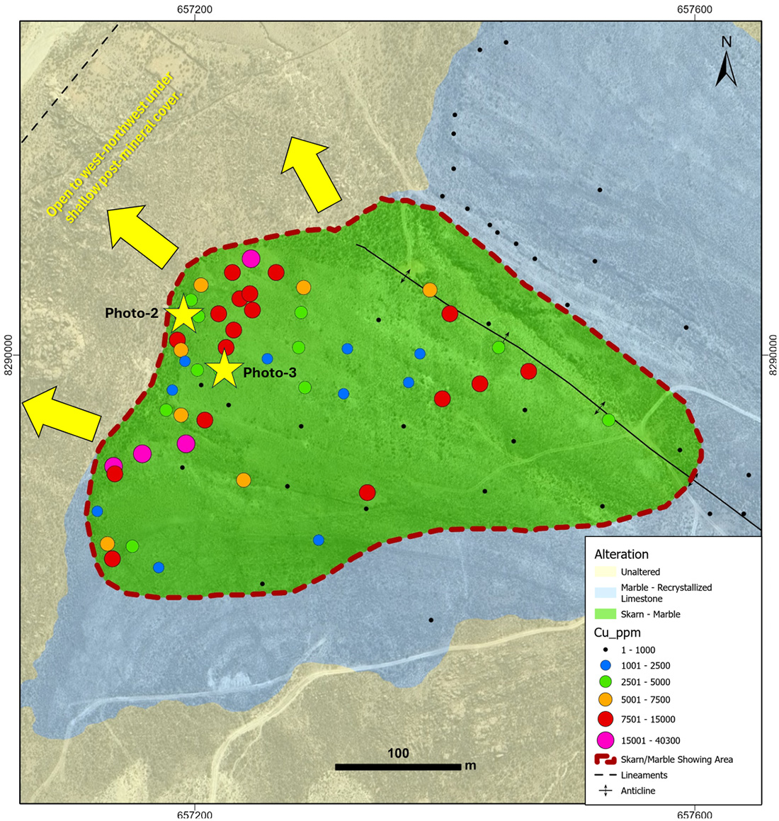 Figure 3: Outline of the Cu rock geochemistry over the Paka showing with 62 samples returning grades greater than 0.01% Cu, including 48 samples exceeding 0.2% Cu and up to 4.03% Cu. Higher-grade Cu values are concentrated within the skarn–marble zone and diminish outward from the core of the showing. The alteration and mineralization remain open to the northwest and west beneath post mineral cover consisting of unaltered Miocene dacites, rhyolites, and volcanic tuffs. The map also shows the location of the outcrop photographs Photo-2 and Photo-3.