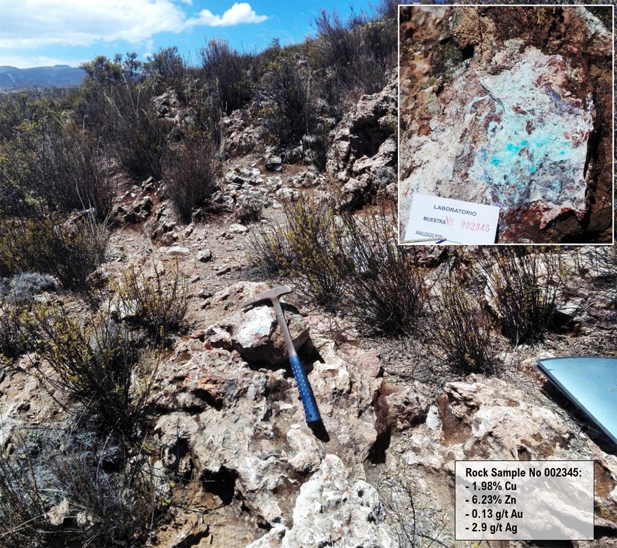 Photo 2: Strongly skarn-marble altered limestones with quartz-limonite stockwork veining with green copper oxides. Rock grab sample taken from the outcrop returned 1.98% Cu, 6.23% Zn, 0.13 g/t Au, and 2.9 g/t Ag.