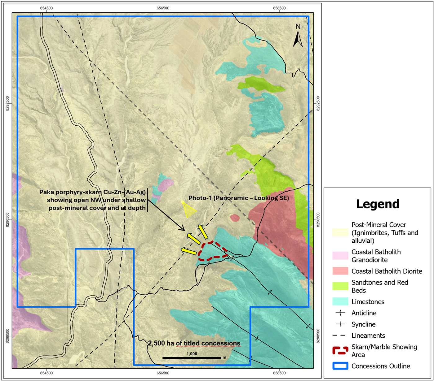 Figure 2: Paka geological map showing the outline of the 2,500 ha of titled concessions and the location of the Paka porphyry-skarn Cu-Zn-(Au-Ag) showing as well as the possible extension to the west and northwest under Miocene post-mineral cover. Map also shows the location of Photo-1 as a panoramic view looking southeast towards the Paka showing.