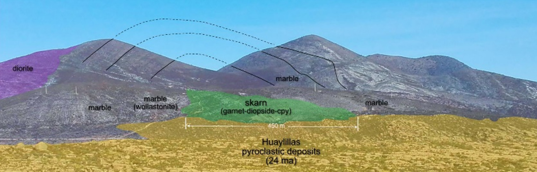 Photo 1: Panoramic view looking southeast towards the Paka porphyry-skarn Cu-Zn-(Au-Ag) showing interpreted to be related to a deeper Paleocene porphyry complex intruded along the anticlinal axis of middle Cretaceous limestone sequences. The skarn-marble alteration and mineralization is unconformable overlain to the northwest by post-mineral Miocene-aged Huaylillas volcanoclastic sequences.