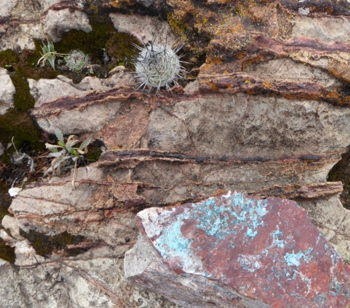Photo 2: Strongly skarn-marble altered limestones with quartz-limonite stockwork veining with green copper oxides. Rock grab sample taken from the outcrop returned 1.98% Cu, 6.23% Zn, 0.13 g/t Au, and 2.9 g/t Ag.