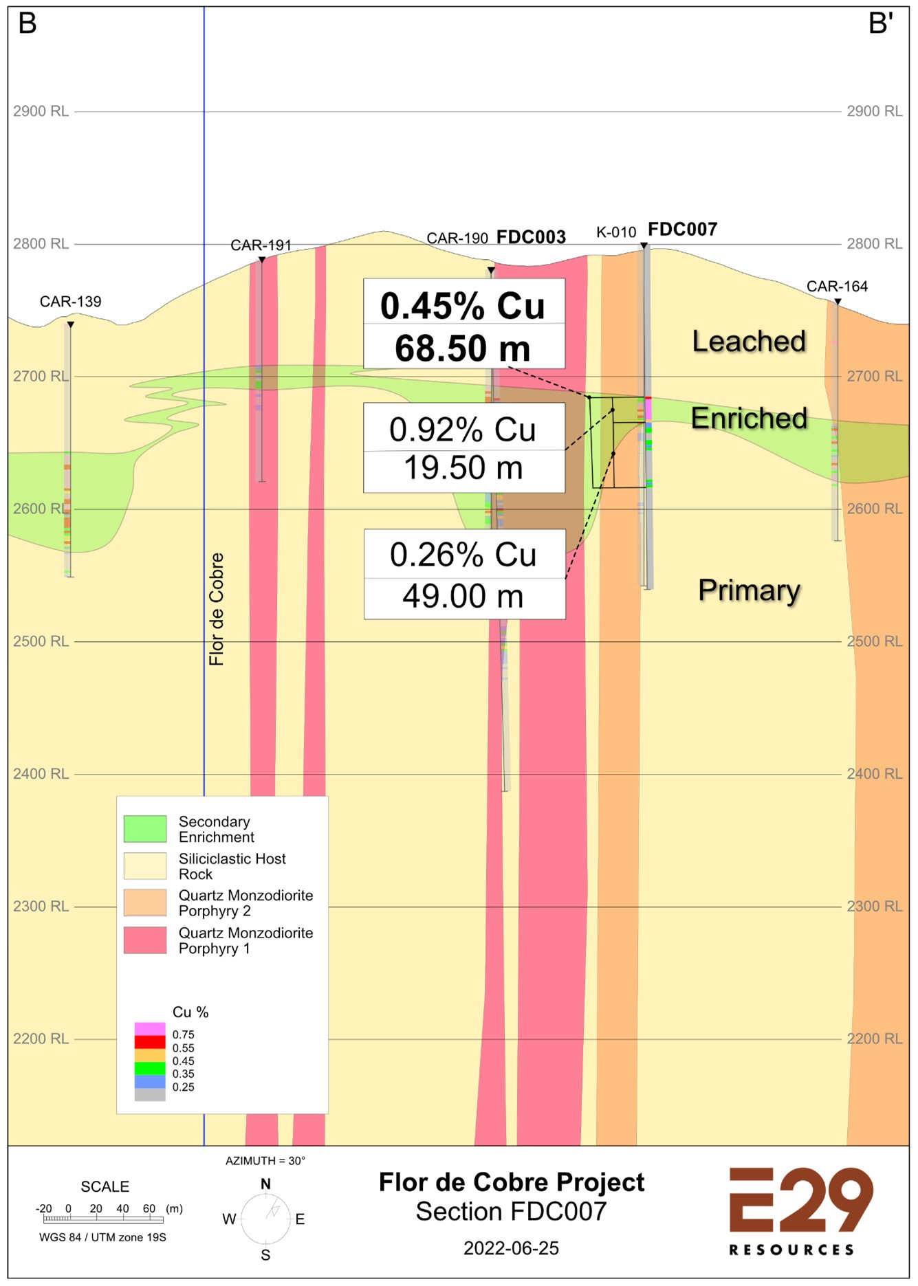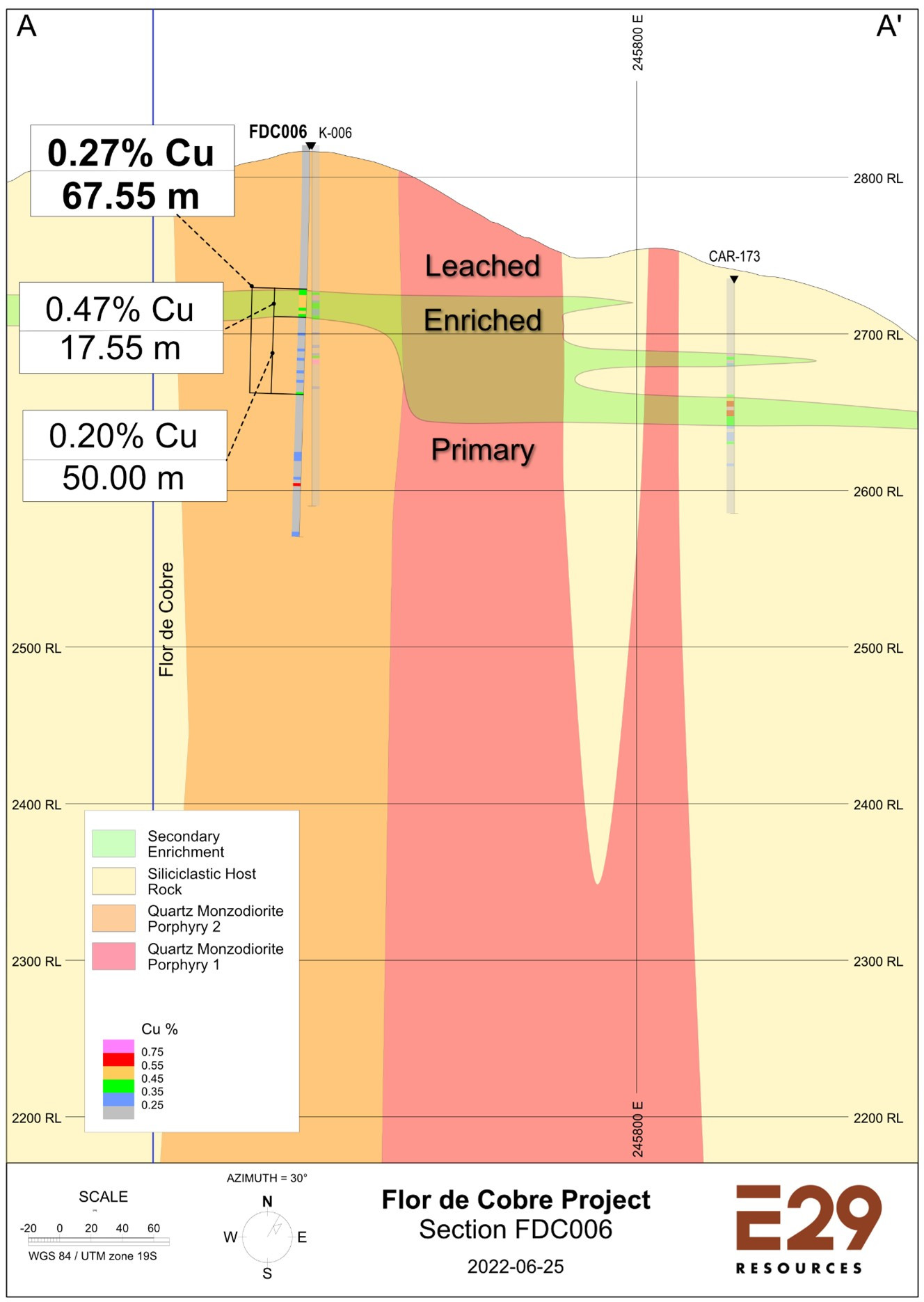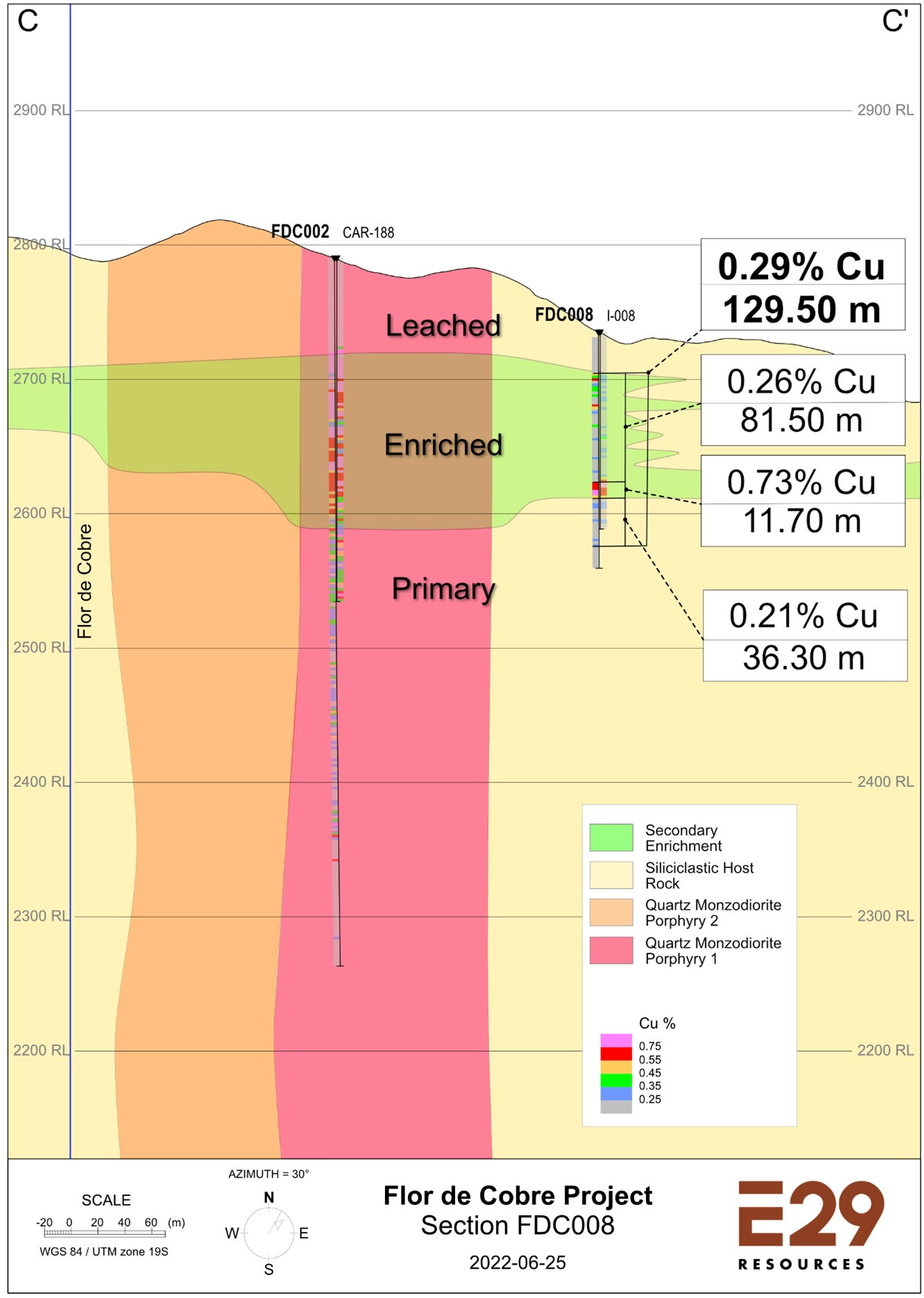 Element 29 has recently taken possession of three (3) historical diamond drill holes completed by Anglo American in 2007 along the perimeter of the Atravezado porphyry Cu-Mo target where quartz veinlet densities are relatively low. The Company plans to complete more geological mapping and sampling as well as detailed logging of these historical drill holes to integrate into the geological model prior to drilling.